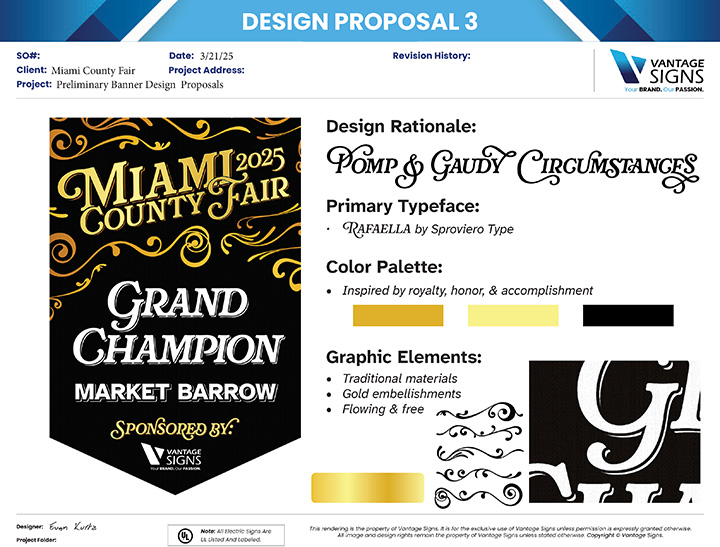 A massive undertaking consisting of little more than 334 banners of 4 different sizes (and shapes)—all with their own award names and sponsors—this year's Miami County Fair banner designs exemplify the hard work and dedication it takes to make it to the top and succeed. The theme for this year's fair was "MVP," which is just the perfect excuse for some gaudy pomp & circumstance.